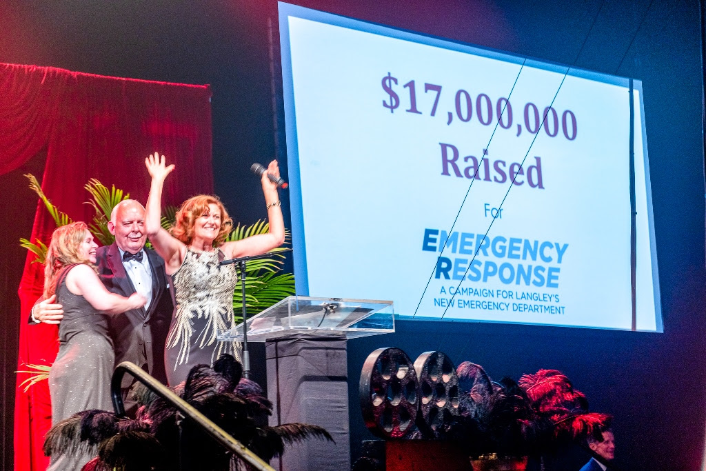 On June 1, surrounded by over 400 of Langley Memorial’s closest friends and supporters at the Old Hollywood Gala, Foundation Executive Director Vivian Smith, Board Chair Ellen Peterson, and Emergency Response Campaign Chair Phil Jackman had the privileged of announcing 113 per cent raised on the $15-million goal to support Langley’s new Emergency Department and MRI Suite.
