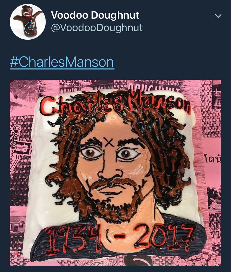 I was just reading about the Voodoo Doughnut shop in Portland Oregon honouring Charles Manson with a doughnut with his image and the words “Charles Manson 1934-2017” Really? They actually tweeted a picture of this doughnut. I wish this shop thought about the poor families whose lives were ruined and will never be the same. I wish they honoured them instead of this horrible man.