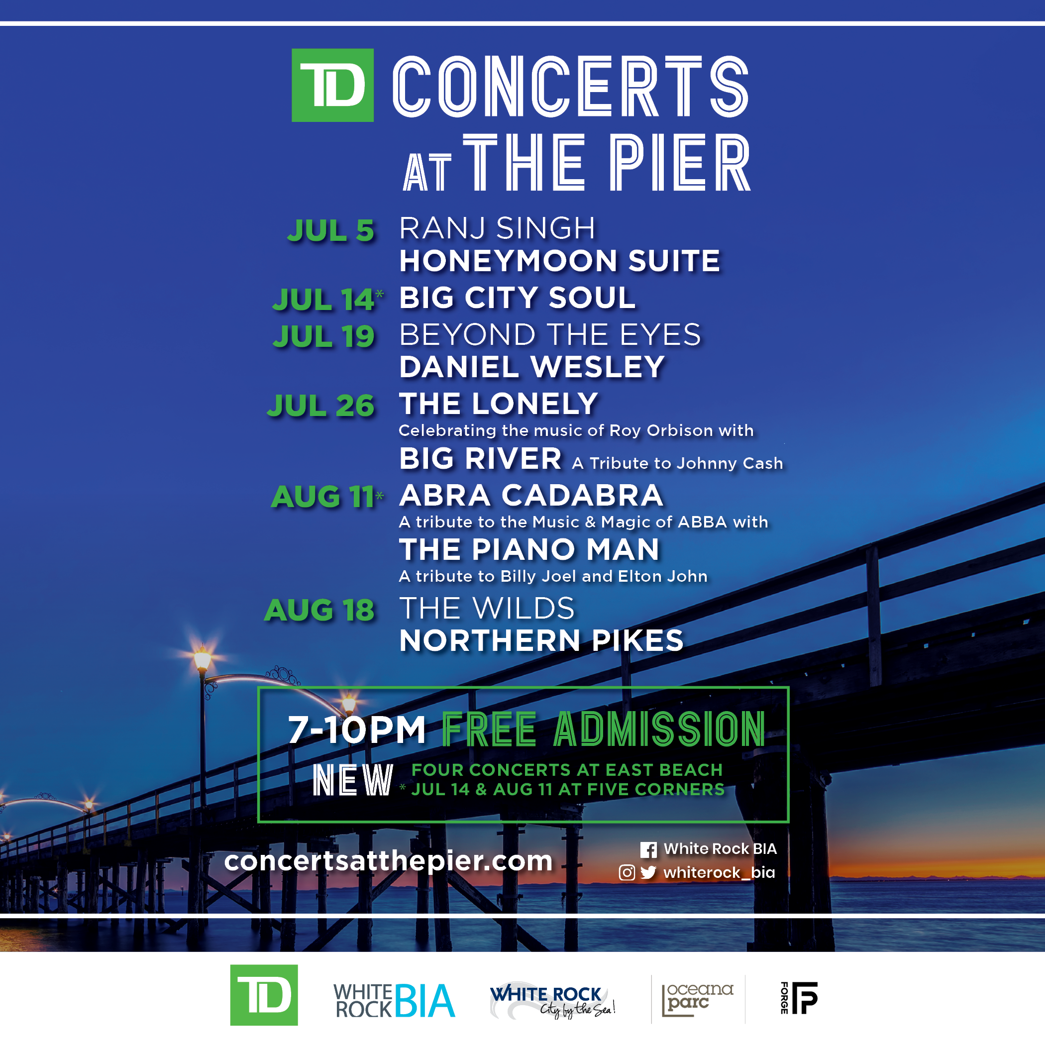 The White Rock Business Improvement Association, TD Bank Group, and the City of White Rock present the 4th annual TD Concerts at the Pier in July and August 2018, sponsored by PULSE FM.