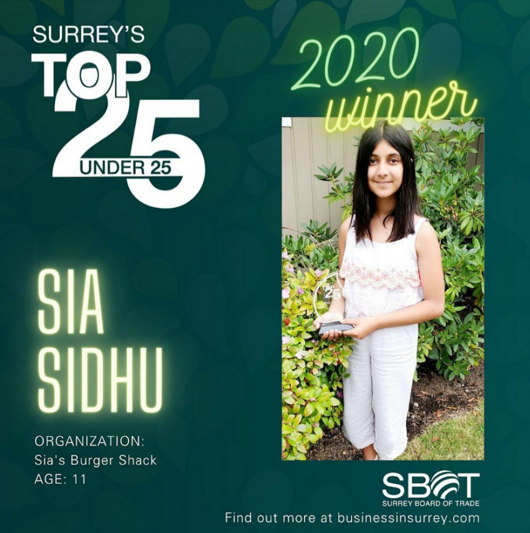 Sia Sidhu is an 11 year old who attends Colebrook Elementary here in Surrey and is the youngest winner of the Surrey Board of Trades Top 25 Under 25.