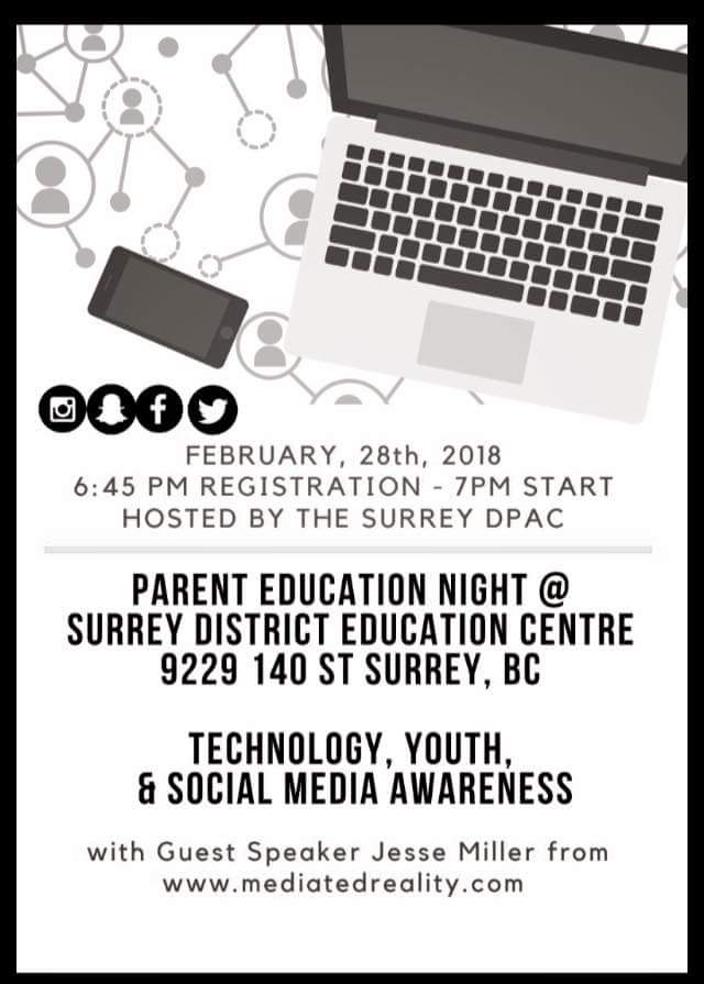 If you’re a parent in the Surrey School District, you are invited to the Surrey DPAC’s Parent Education Night on Technology, Youth and Social Media Awareness with renowned expert Jesse Millar. This will be on February 28 at the District Education Centre with registration beginning at 6:45PM.