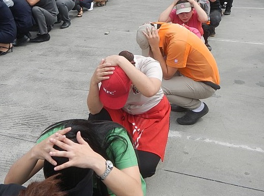 “If there isn’t a table or desk near you, drop to the ground in an inside corner of the building and cover your head and neck- with your hands and arms.”