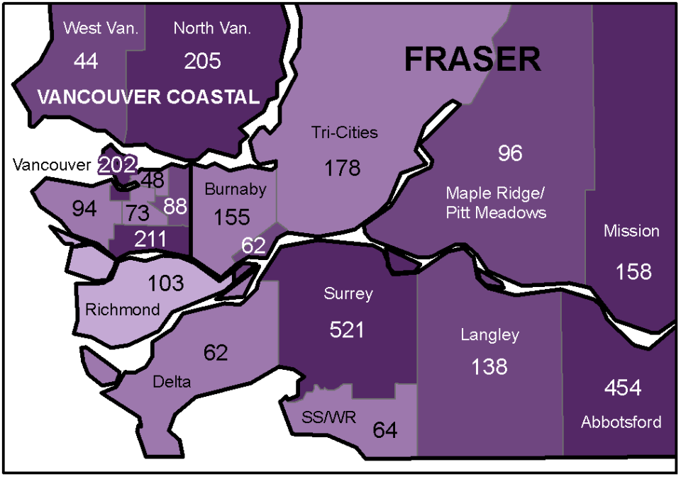 In the Fraser Health region, Surrey has had the most cases, followed by Abbotsford at 454, Mission at 158 and Langley at 138.