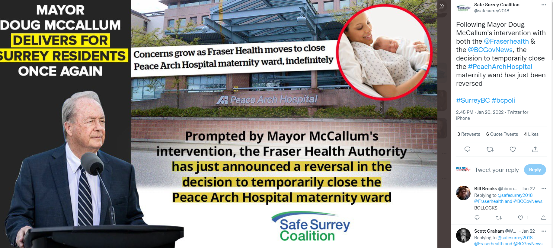 Surrey Mayor Doug McCallum’s Safe Surrey Coalition party has gone on a Twitter tirade defending it was McCallum who ultimately changed Fraser Health’s mind to reopen the Peace Arch Maternity Ward.