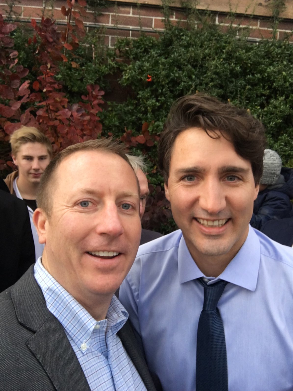 They waited in line with their cameras, and he appeared…Our selfie-friendly Prime Minister was in White Rock earlier today. My friend, ‘Gord’ we’ll call him – who claims not to be a fan of the PM in any way shape of form let me know via a pizza and poop emoji last might that he wanted nothing to do with the PM or his visit. Although we don’t talk politics very much, he makes it perfectly clear he’s not a big fan – and again – had no trouble griping about him via texts back and fourth last night. And then earlier this afternoon he sent a picture taken outside Laura’s Coffee at Five Corners. And then he sent another picture…