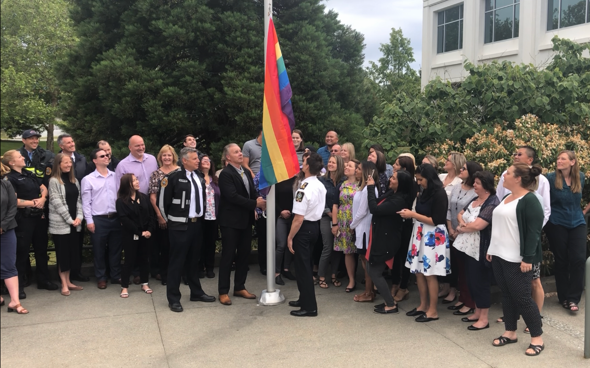 Mayor George V. Harvie helped raise the Pride flag in front of Delta City Hall today in support of the LGBTQ+ community, Ladner United Church, and all Delta citizens who stand for inclusion and acceptance and against intolerance and discrimination.