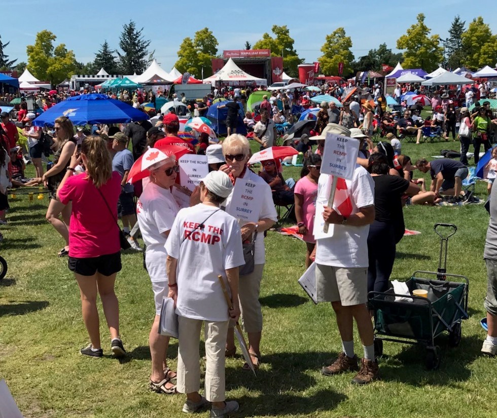 Despite being denied a booth at Surrey’s Canada Day event, a man petitioning to keep the RCMP in Surrey showed up anyway, with t-shirts, placards and petitions in hand.