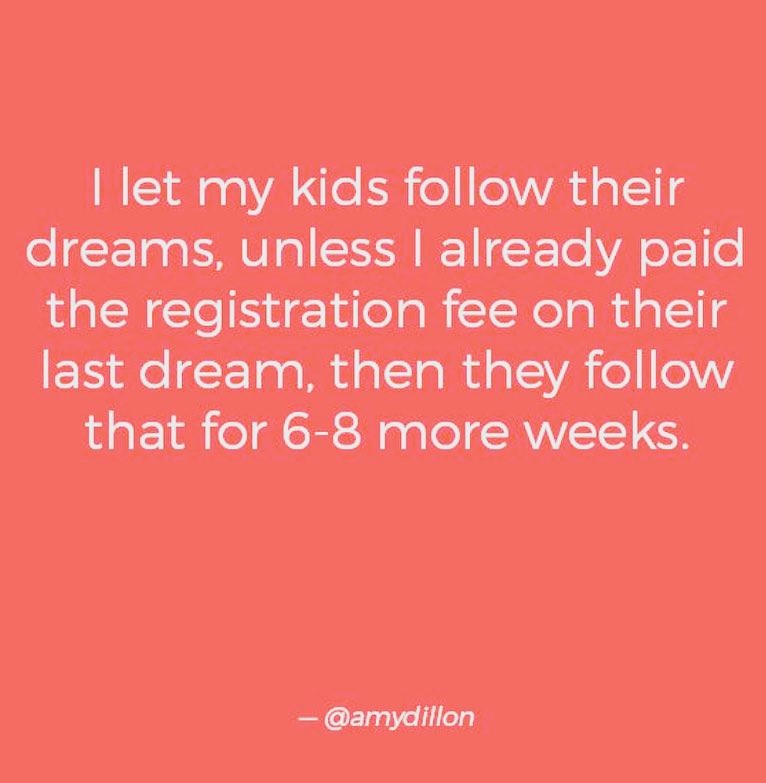 So, my daughter is now “retired” from soccer and likely all other sports, as she told me recently, “I don’t really care about chasing a ball.” You have to respect a girl who knows what she wants. We’ve also tried ballet (too slow), hip hop (I only like my own dancing), acting (I already know how to act) and piano (I like making up my own songs). My middle son has moved on to basketball, which I love because there is less equipment to buy and then find before games, and no half hour warm ups. Bonus: inside sport! He’s taken up parkour which will be useful for a career as Spiderman.