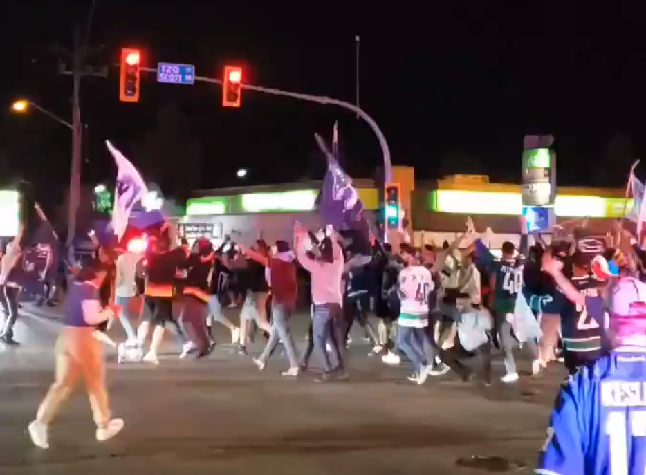 For years Scott Road and 72nd Avenue has been a hot spot for fans to gather after the Canucks win to celebrate. More than a thousand coming out after the Canucks beat the Blues a few weeks back to advance to round two where large crowds completely took up the intersection, which is concerning for RCMP and public officials given we’re still in the middle of a global pandemic and told to, more or less, stay away from one another.