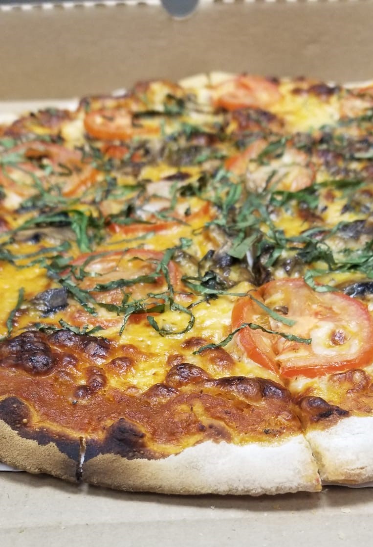 the Tomato Basil Pizza (organic tomato sauce, mozzarella, crimini mushrooms, roma tomatoes, mozzafina di latte, and basil),