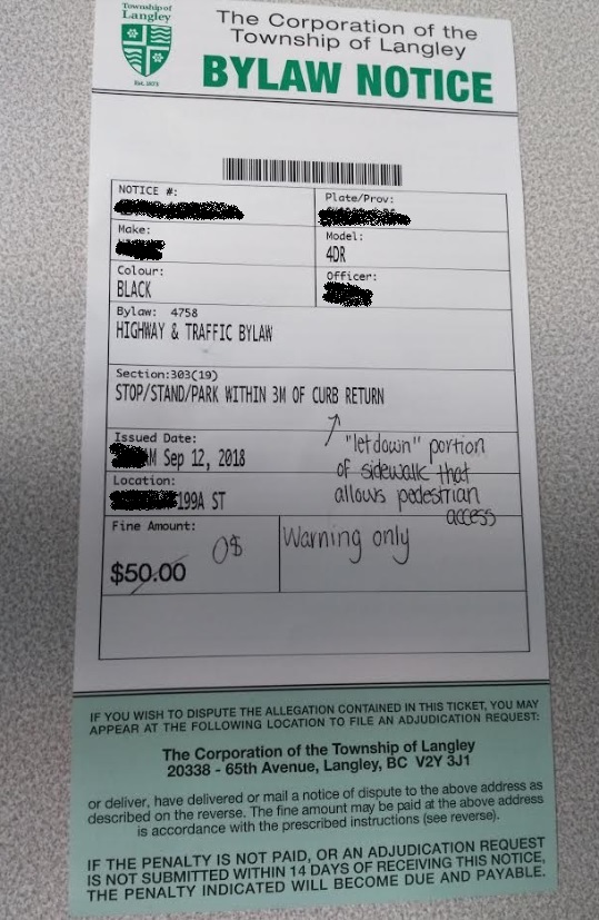 But also, I’m feeling a little lucky today because the bylaw officer wrote on my ticket that this was just a “warning” – and crossed off the $50 fee with their pen, writing $0 instead.