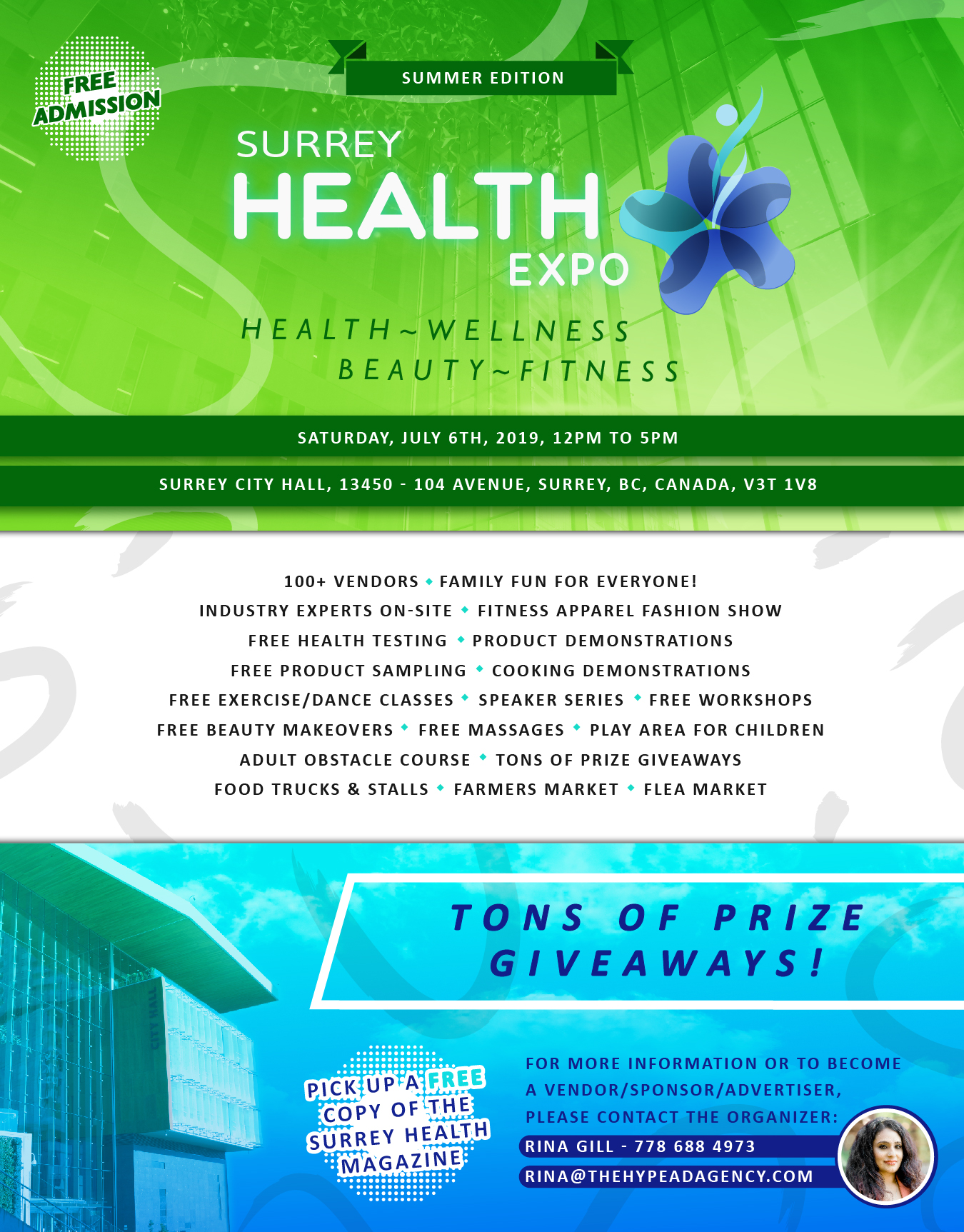 Surrey Health Expo is the only mainstream tradeshow for Surrey residents focusing on the health, wellness, beauty and fitness industry. This initiative is important for the community and encourages them to be proactive about their health vs. reactive. The 3rd annual Surrey Health Expo is taking place from 12pm to 5pm on Saturday, July 6th at Surrey City Hall. Attendees can take advantage of FREE ADMISSION and family fun for everyone!