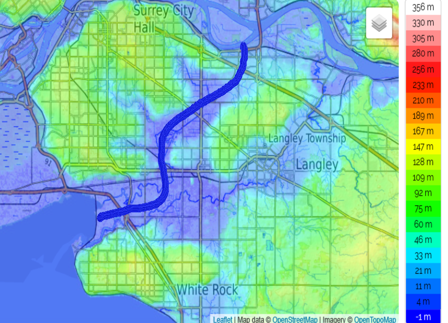 The problem with that is most of Surrey is closing in on 100 meters above the Fraser. With water naturally flowing downhill, there aren’t a lot of places where one could be build from the Fraser.