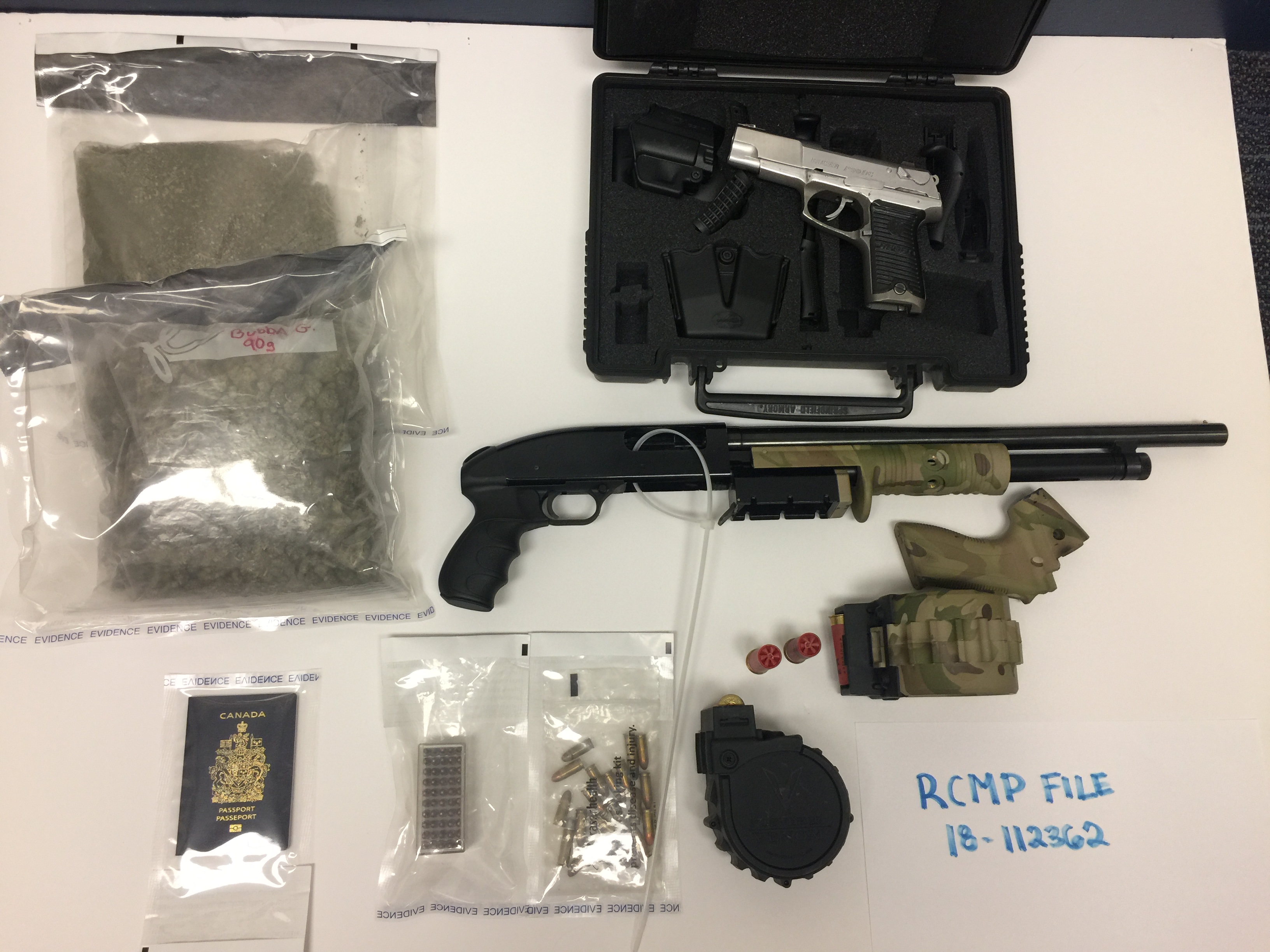The warrant resulted in the seizure of a modified Mossberg 500 tactical shotgun (semi-automatic), two high-capacity prohibited rotary shotgun magazines, a Ruger P90 handgun, ammunition, varying amounts of marijuana, methamphetamine, and prescription drugs, stolen identification and property, and fraudulent documents in varying stages of preparation.