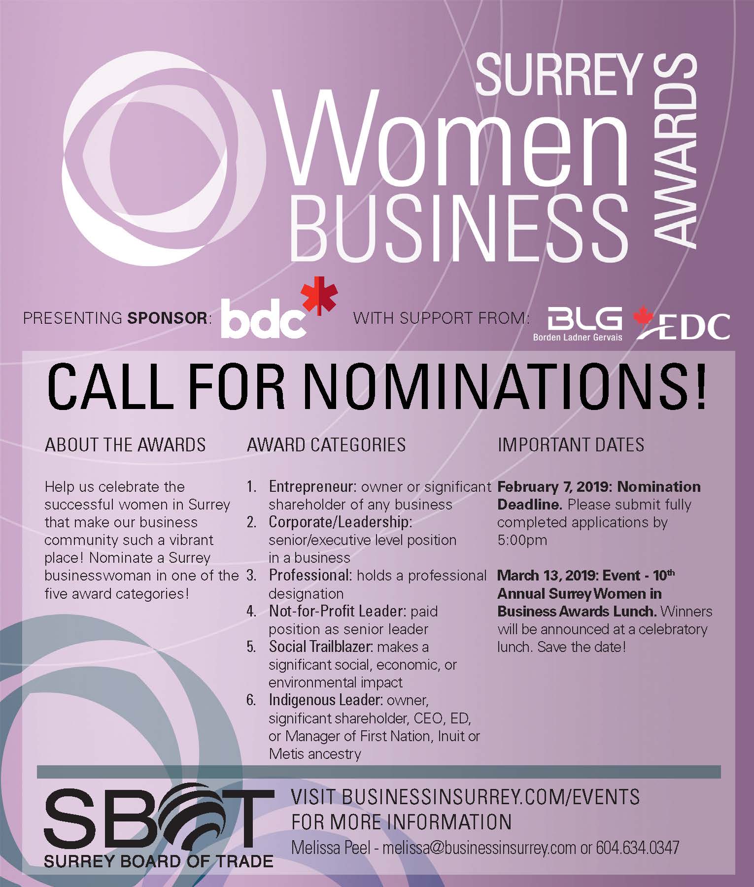 Know an inspiring business woman that deserves to be recognized? Nominations for the Surrey Women in Business Awards is running now until February 8th!