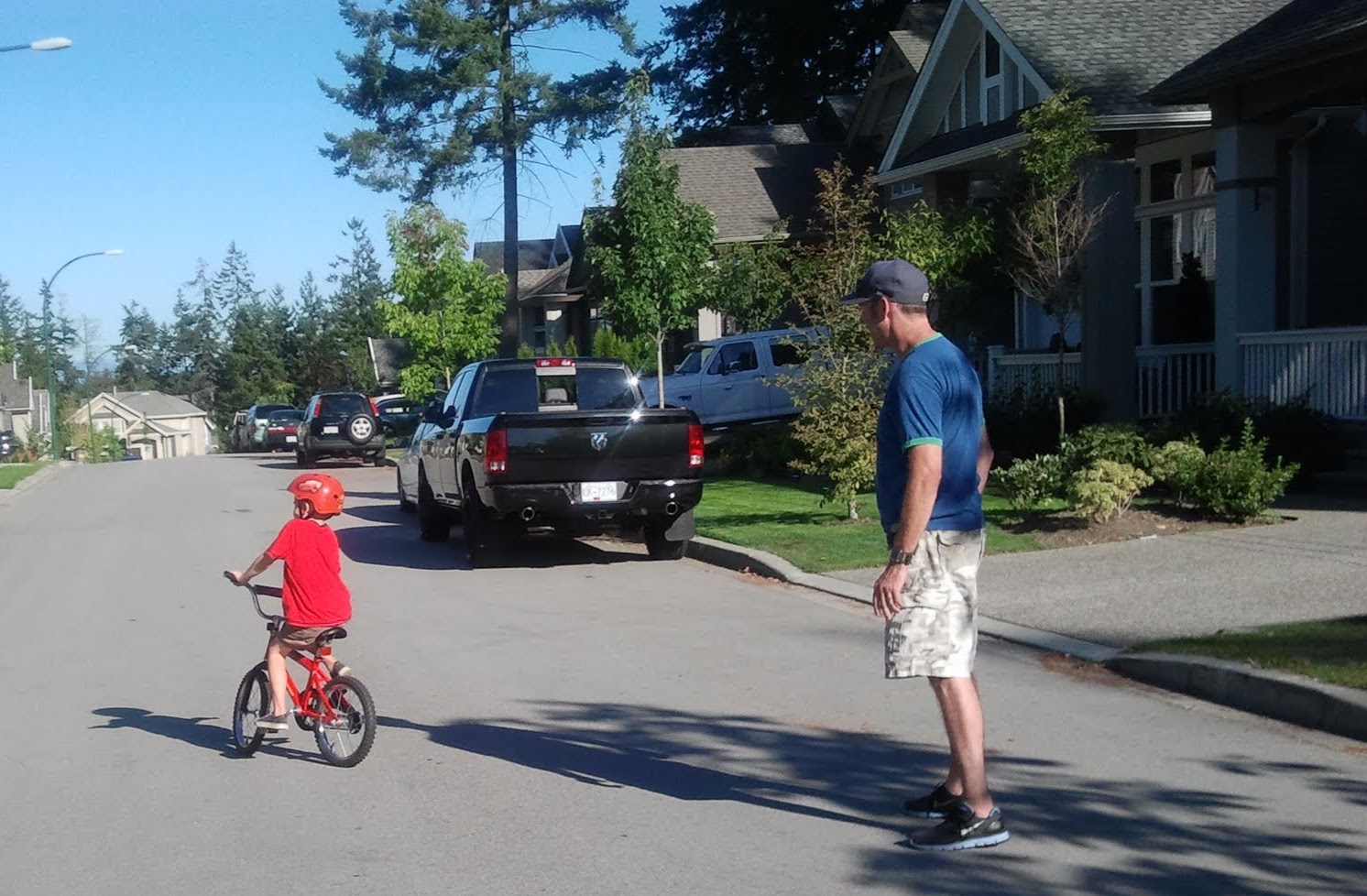 I learned to bike on my own. My dad held on to the back of the seat for a while and then I had to just master it myself on my Canadian Tire Supercycle. I just kept trying and then one day it kicked in. Same with my eldest son, we all took turns hanging on to the back of the bike and sending him on his way.